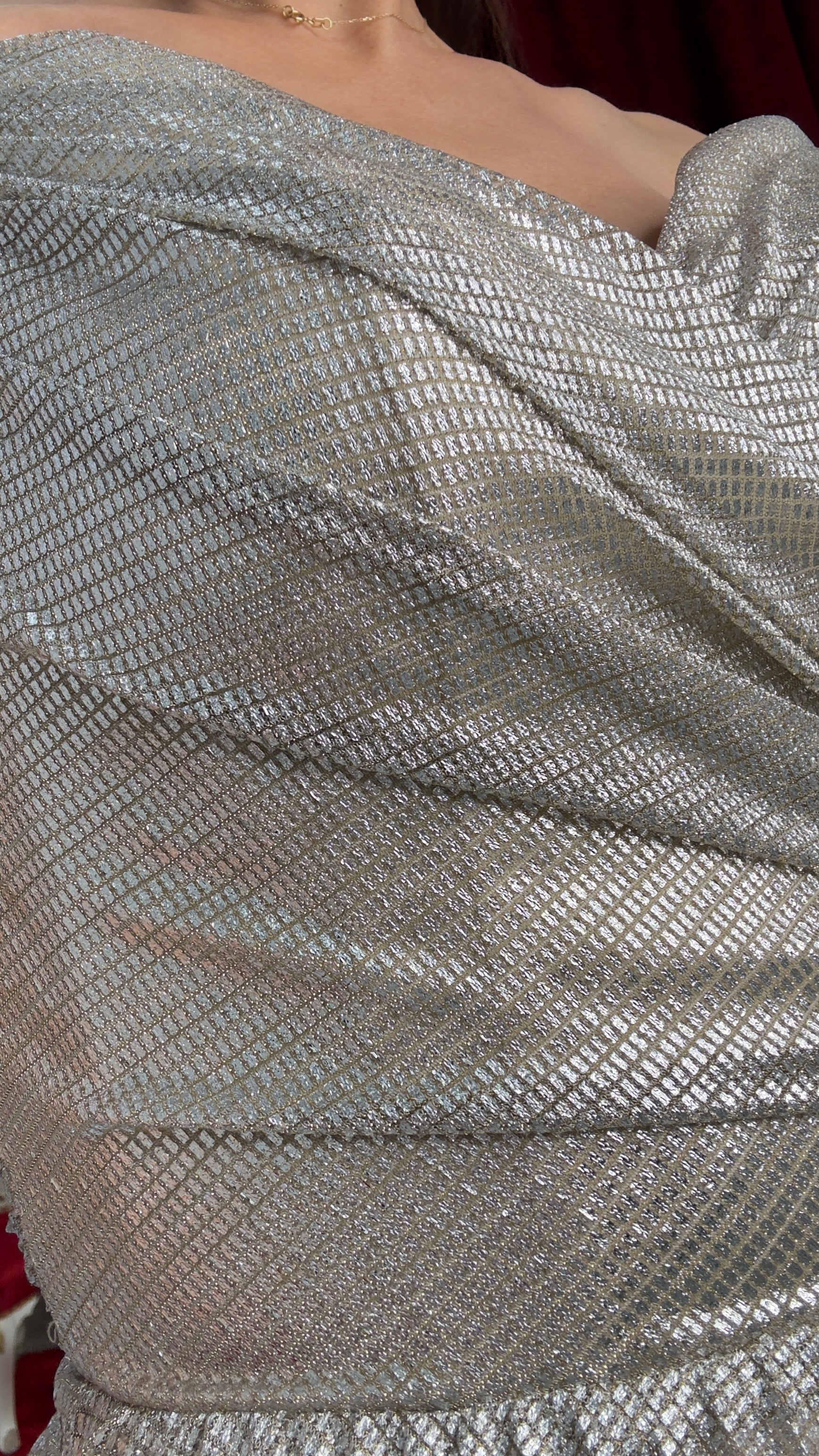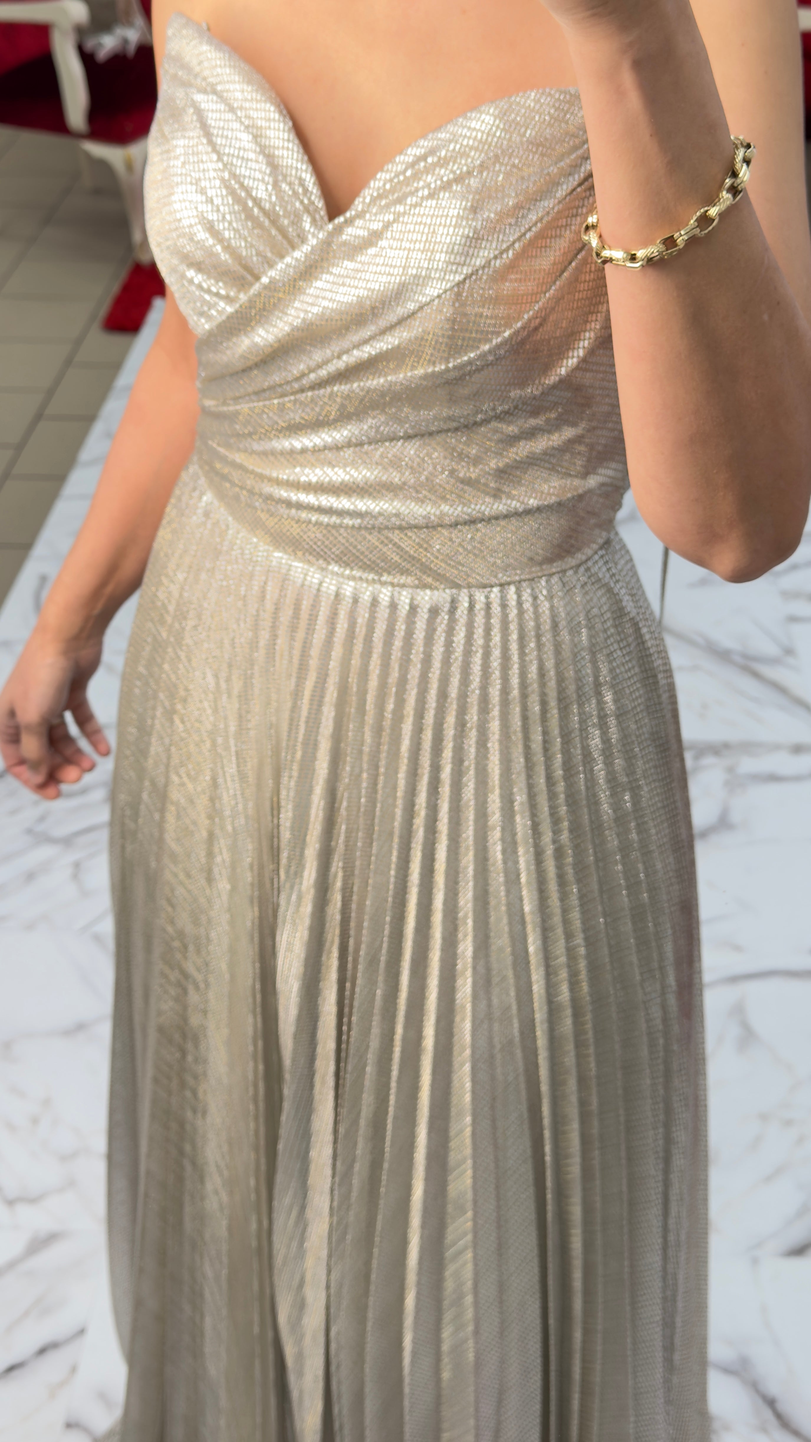 Dieses elegante Abendkleid überzeugt durch seinen femininen Schnitt und den edel schimmernden Plissee-Stoff.